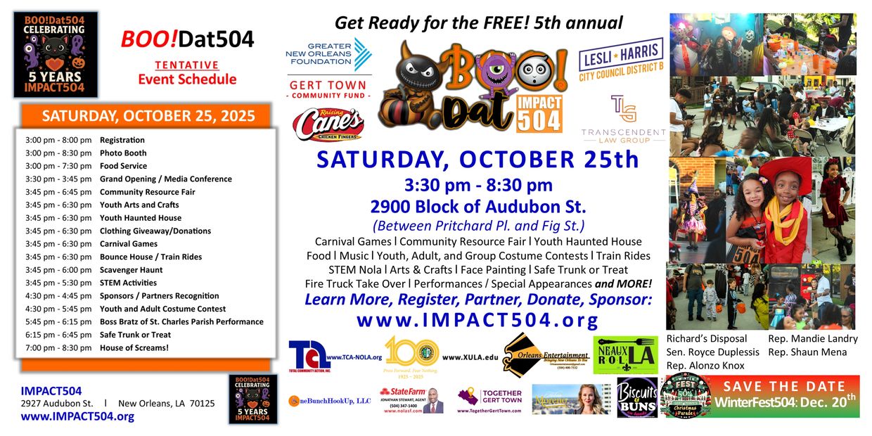 Our organization is actively involved in the community, bringing love and spreading hope through events like the BOODat504 Halloween Community Extravaganza, while also working to change lives during impactful initiatives such as HEALTHY504 and IMPACT504 DAY. We proudly participate in the IMPACT504 Krewe de Charite and look forward to celebrating together at the WinterFest504 Gert Town Community Christmas Parade Giveaway.